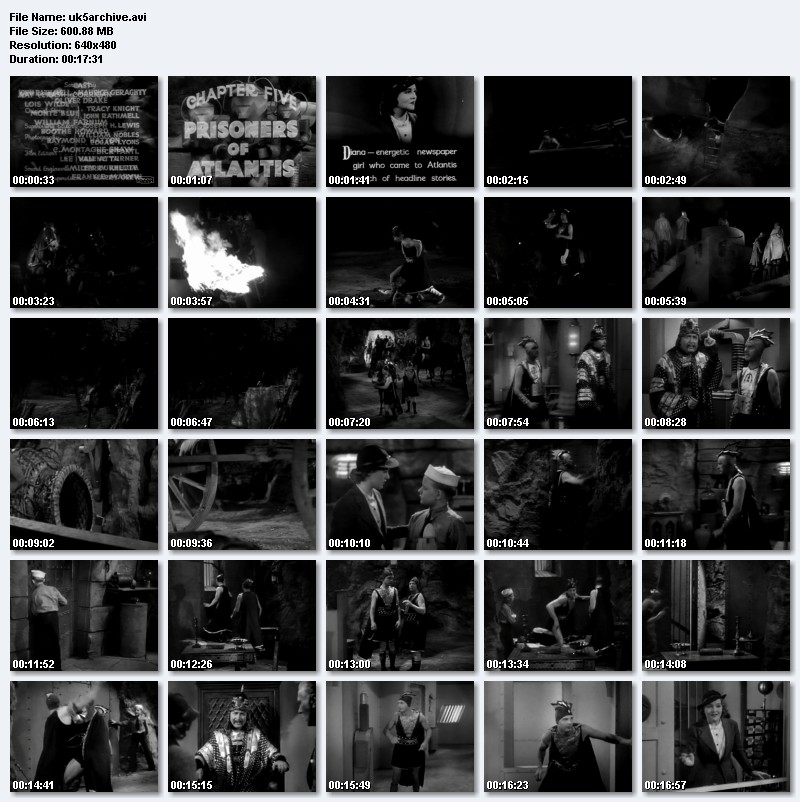 Crash Corrigan, a recent graduate of Annapolis, and Diana, a go-getting reporter, join Professor Norton for a search for the source of a string of earthquakes, Atlantis. They ride Prof. Norton's rocket submarine searching the sea and little Billy Norton, the professor's son stows away, of course. When they find Atlantis they are caught in a war between peaceful Atlanteans, note their white capes, and war-monging Atlanteans, note their black capes. After many harrowing moments for Crash, Diana, Prof. Norton and Billy, they barely get away with their lives when they escape a tower of Atlantis raised to the surface for the sole purpose of dominating or destroying the Earth (Which one depends on the compliance of the upper world dwellers.) |